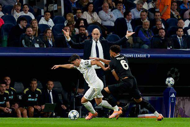 尤文图斯表面上仍然是惯用的3421阵型,但具体站位更像是一个5311,耶尔德兹充当前场自由人,压缩后场空间让皇马打不进来,并利用快速转移形成反击。事实证明,尤文这些球员不是踢不好球,只是无法在多线作战中维持高强度高效率。对阵皇马是近一个月以来,球员们最有斗志最专注的比赛,开场仅7分钟,球队就打出了一波流畅配合。从凯利在边路受到干扰解围开始,皮球经过了坎比亚索、耶尔德兹、赫夫朗·图拉姆后,巴尔韦德略有干扰,没有阻止皮球来到弗拉霍维奇的脚下,他也不停球敲给已经突围的坎比亚索,接着是分给右路一片开阔地的卡卢卢,只可惜法国边翼卫传中缺乏变化,没能看到后点包抄的两个队友。